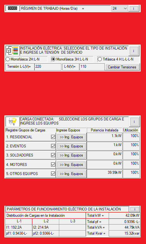 • Presentación de Parámetros de Funcionamiento eléctrico de la Instalación: Con el objetivo de orientar al Usuario y, como un subproducto de los cálculos realizados para el dimensionamiento de la planta eléctrica requerida, se presentan los parámetros eléctricos de funcionamiento de la instalación eléctrica, en cuanto a potencias consumidas y distribución de cargas.