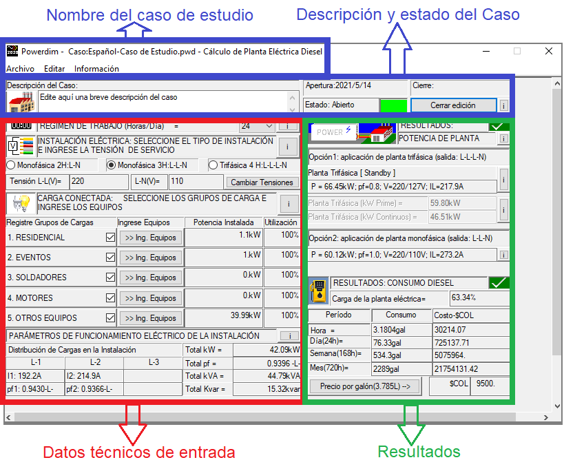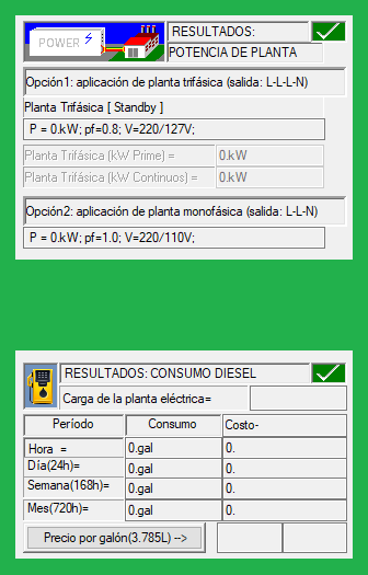 Resultados: Potencia de la Planta Eléctrica: Opción1: Planta Trifásica Standy, Prime y Continua; Opción2: Planta Monofásica(si aplica). Adicionalmente se presenta el consumo y costo de combustible Diesel.