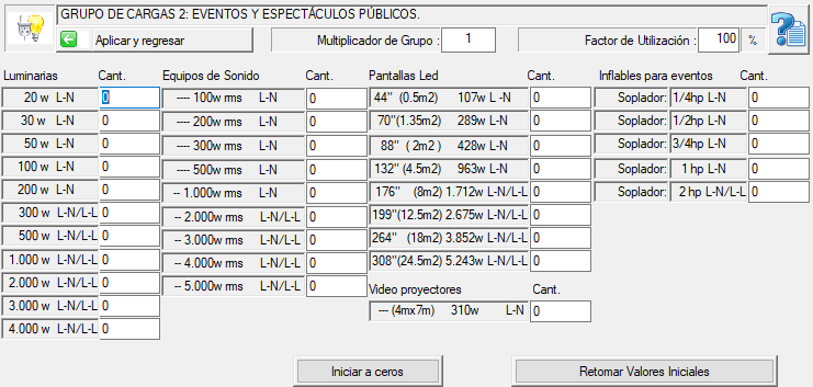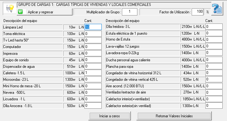 Sólo se requiere ingresar todas las cantidades para cada equipo y luego dar clik en el botón <<Aplicar y Regresar>>.  Este grupo de cargas cuenta igualmente con los cuadros de edición para modificar el factor Multiplicador de Grupo y el Factor de Utilización.