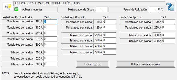 Sólo se requiere ingresar todas las cantidades para cada tipo de equipo y luego dar clik en el botón <<Aplicar y Regresar>>.  Este grupo de cargas cuenta también con los cuadros de edición para modificar el factor Multiplicador de Grupo y el Factor de Utilización.