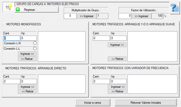 En este caso se requiere conocer los datos de la placa de los motores que conforman la instalación y cuál es su tipo de arranque. Esta información requiere la participación del técnico electricista, quién debería recopilar dichos datos. Contando con esta información, se ingresan cantidades y potencias (en hp) para cada tipo de motor según su tipo de arranque, presionando los botones de <<Ingresar>>.