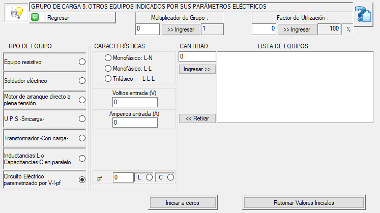 En este caso se requiere conocer también los datos de la placa de los equipos que conforman la instalación para registrar el tipo de equipo, características eléctricas y cantidad. Esta información requiere la participación del técnico electricista, quién debería recopilar dichos datos. Contando con esta información, se ingresan cantidades haciendo click en el botón Ingresar>>.